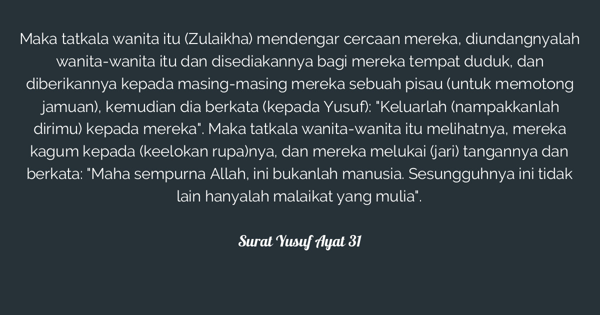 Bacaan surat yusuf ayat 31 dan amalannya bisa untuk memikat pria? Read surah yusuf ayat 31 (12:31) with translation. Materi kali ini masih berkaitan dengan surat yusuf yakni kutipan surat yusuf ayat 31 teks latin dan arab serta artinya per kata. Kutipan surat yusuf ayat 31 dengan artinya perkata ini diharapkan bisa membantu sobat dalam memahami ayat tersebut secara mendetail.